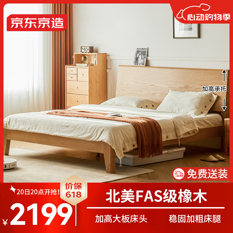 京东京造实木床 FAS级橡木|加高大板床头|加粗床腿 主卧双人床1.8×2米BW03价格:2399.00元!