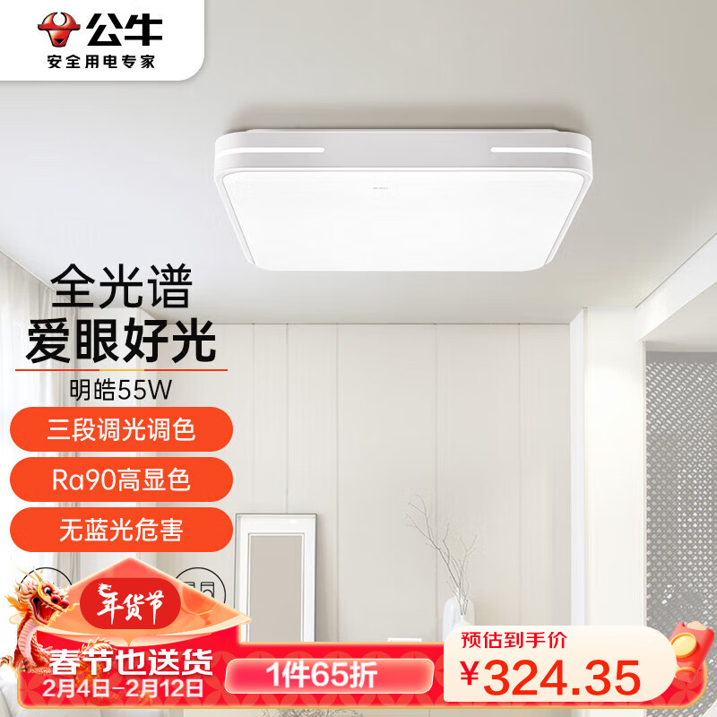 公牛(BULL)吸顶灯全光谱MX-B055E-CS明皓卧室灯北欧现代简约方形三段调光55W价格:499.00元!
