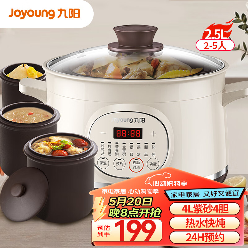 九阳(Joyoung)电炖锅 燕窝电炖盅2.5L+0.5L*3容量隔水柔炖紫砂内胆一锅四胆煲汤锅GD522价格:199.00元!