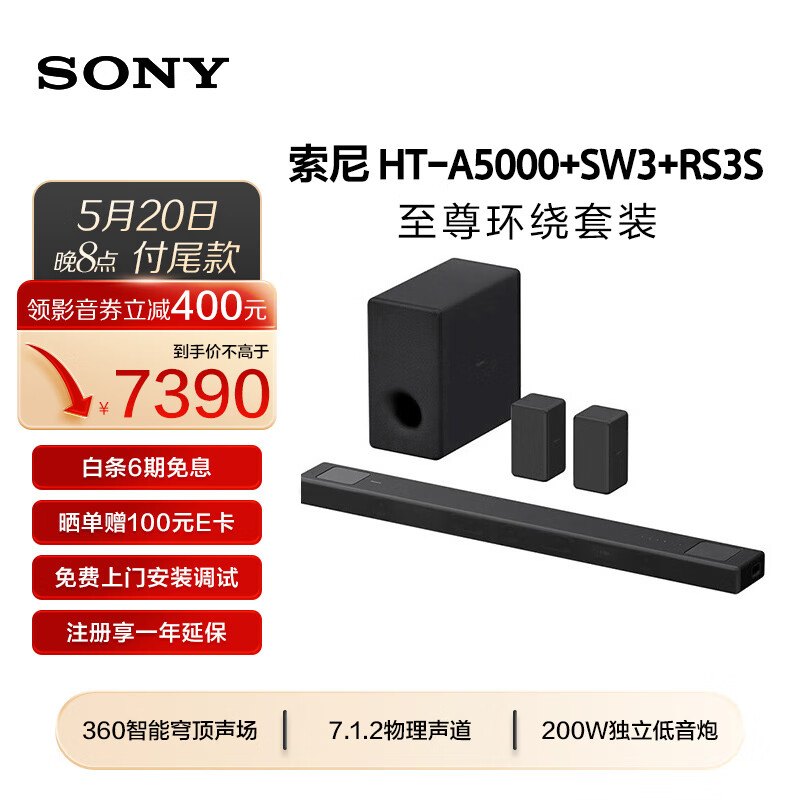 索尼(SONY)HT-A5000+SW3+RS3S 环绕套装 7.1.2 全景声 360智能穹顶 4K/120Hz 回音壁 家庭影院 电视音响价格:7790.00元!