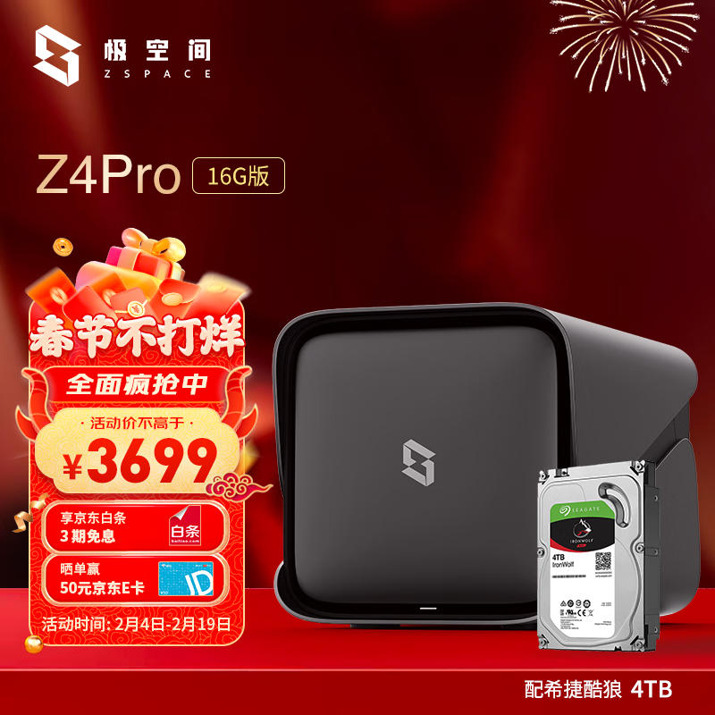 极空间私有云Z4Pro 16G版四盘位Nas网络存储家庭个人相册备份文件同步【配4T希捷酷狼硬盘】钛金灰价格:3899.00元!