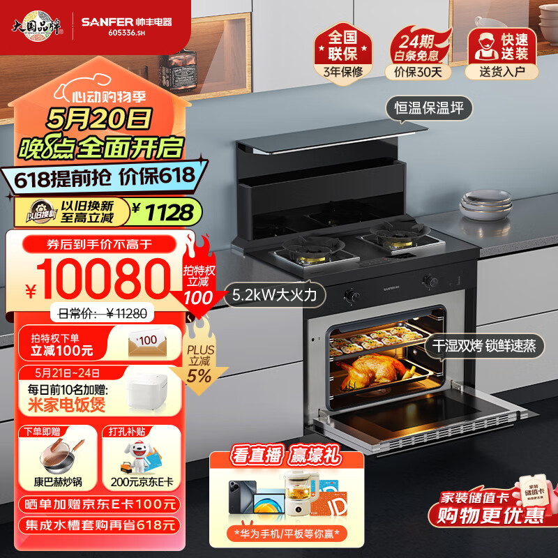 帅丰(SANFER)集成灶一体式 蒸烤箱一体机 家用蒸烤一体变频集成灶 J2-7B 5.2kW猛火燃气灶 天然气价格:11280.00元!