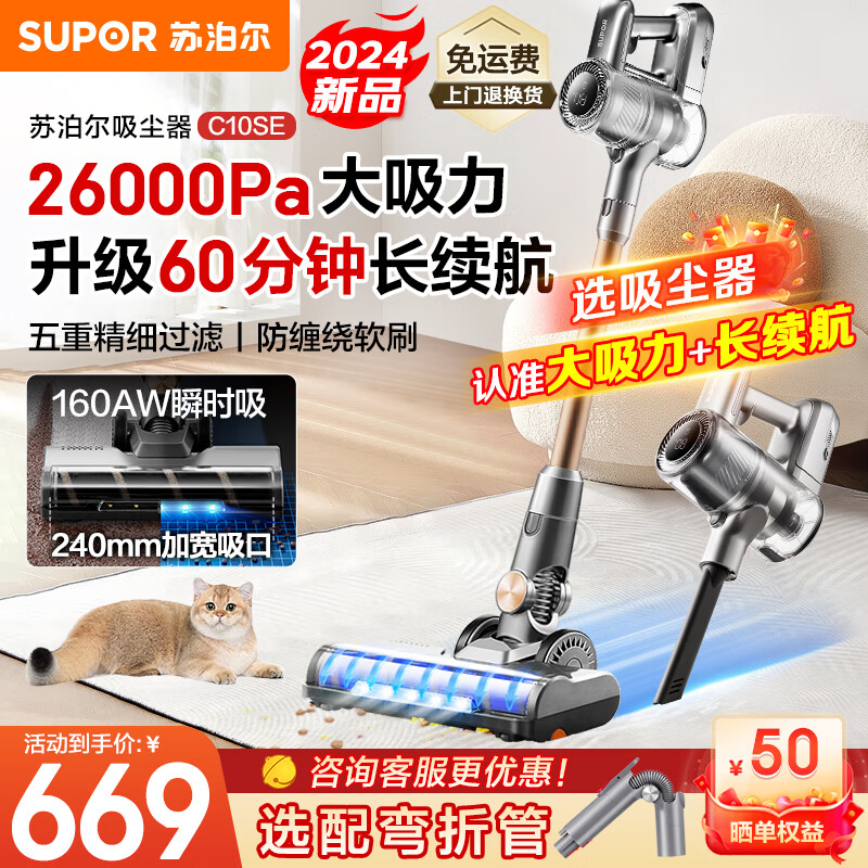 苏泊尔(SUPOR)吸尘器26Kpa大吸力家用无线手持大功率吸拖一体机轻量60分钟长续航除螨宠物家庭适用C10SE价格:699.00元!