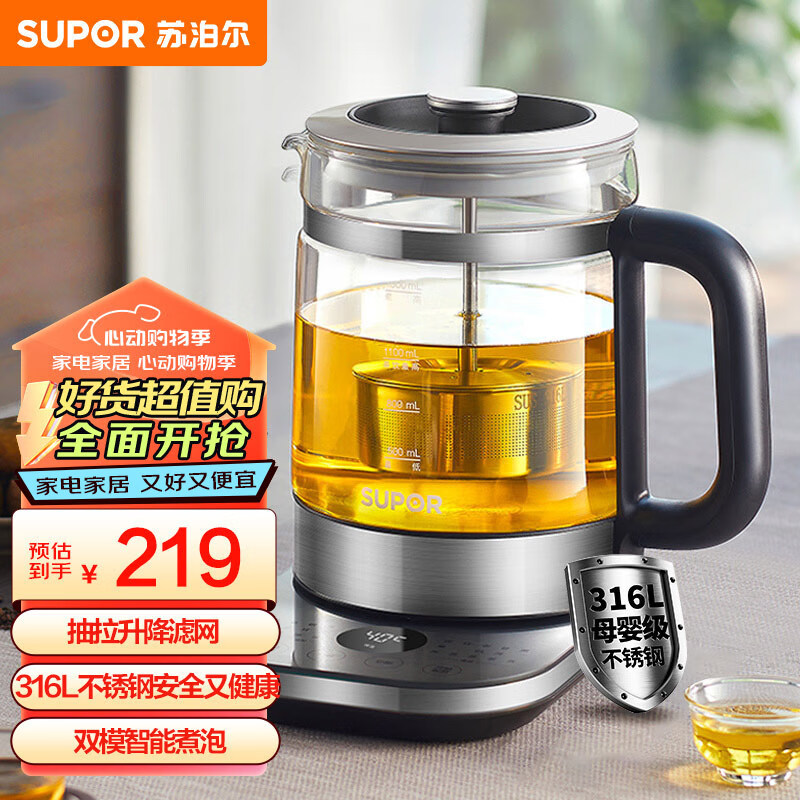 苏泊尔(SUPOR)养生壶1.5L煮茶器花茶壶 玻璃电茶壶 316L不锈钢电水壶烧水壶电热水壶 保温煮茶壶黑茶 SW-15C01价格:219.00元!