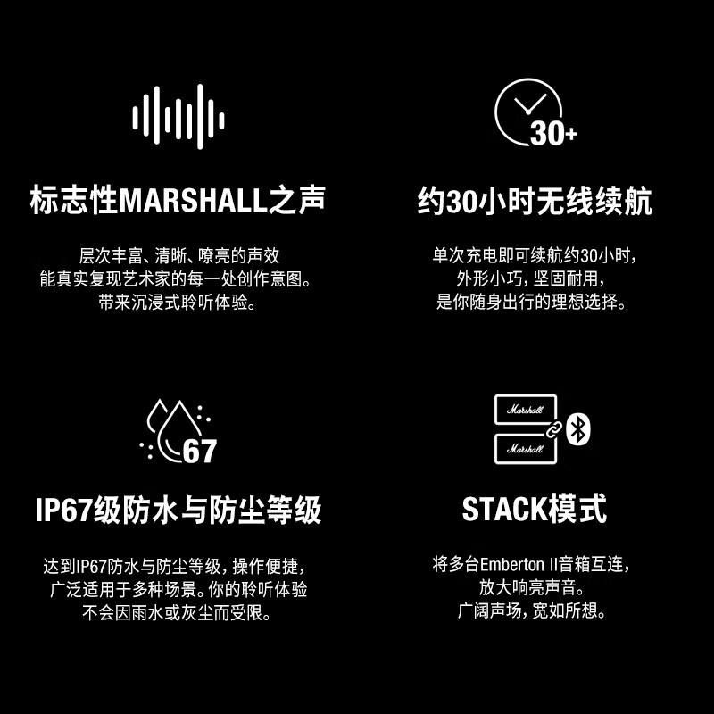 MARSHALL(马歇尔)EMBERTON II 音箱便携式2代无线蓝牙家用户外防尘防水小音响 冷钢黑价格:1399.00元!