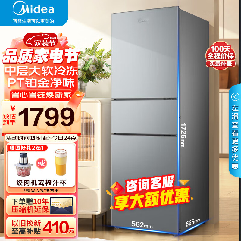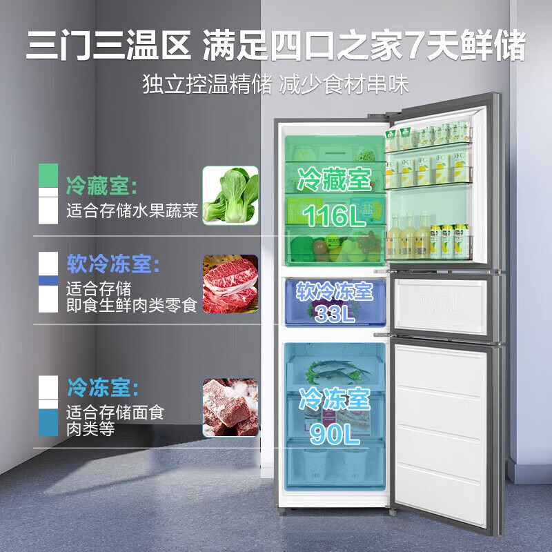 美的(Midea)冰箱239升风冷无霜三开门小型家用保险电冰箱节能软冷冻低音三门三温租房小冰箱BCD-239WTM价格:1798.00元!