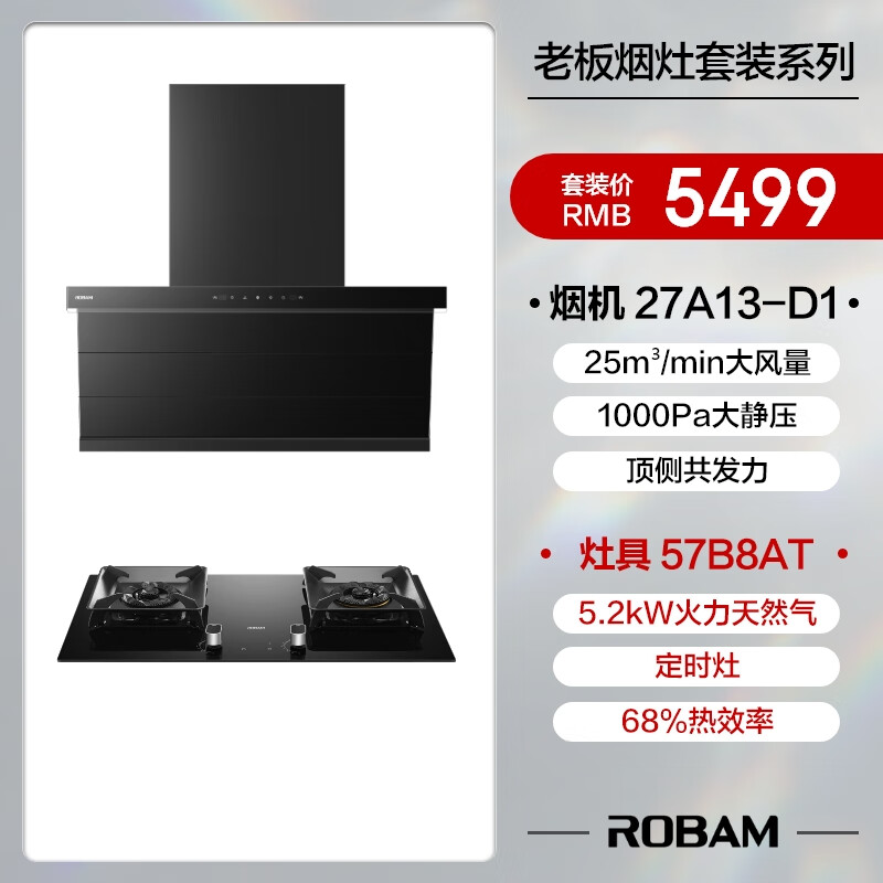 老板(Robam)油烟机家用顶侧双吸抽油烟机大吸力25风量一级能效侧顶吸油烟机家用燃气灶27A13-D1+57B8A天然气价格:6099.00元!