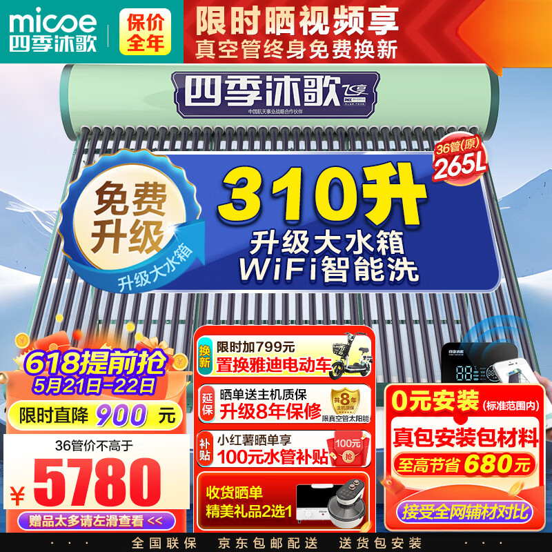 四季沐歌(MICOE)飞享WIFI智控太阳能热水器 家用光电两用 自动上水 带电加热 6分独立双管口 36管265L送货+安装价格:6680.00元!