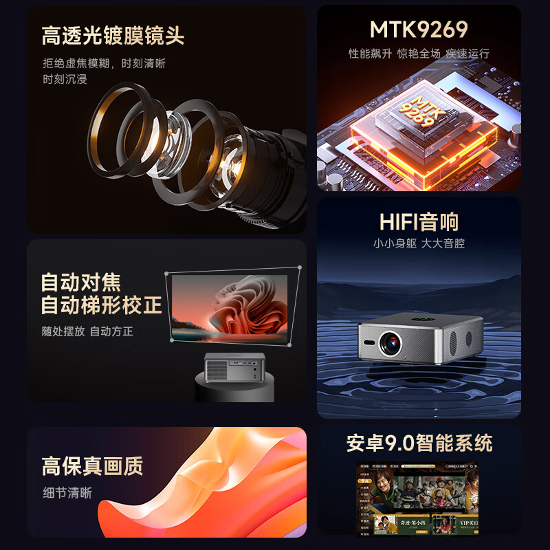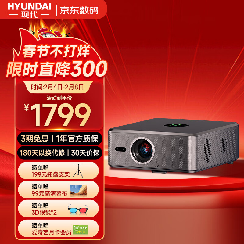 HYUNDAI现代A8 投影仪家用办公 1080P智能高清家庭影院(全自动对焦 自动梯形校正 画质高亮升级)价格:2099.00元!