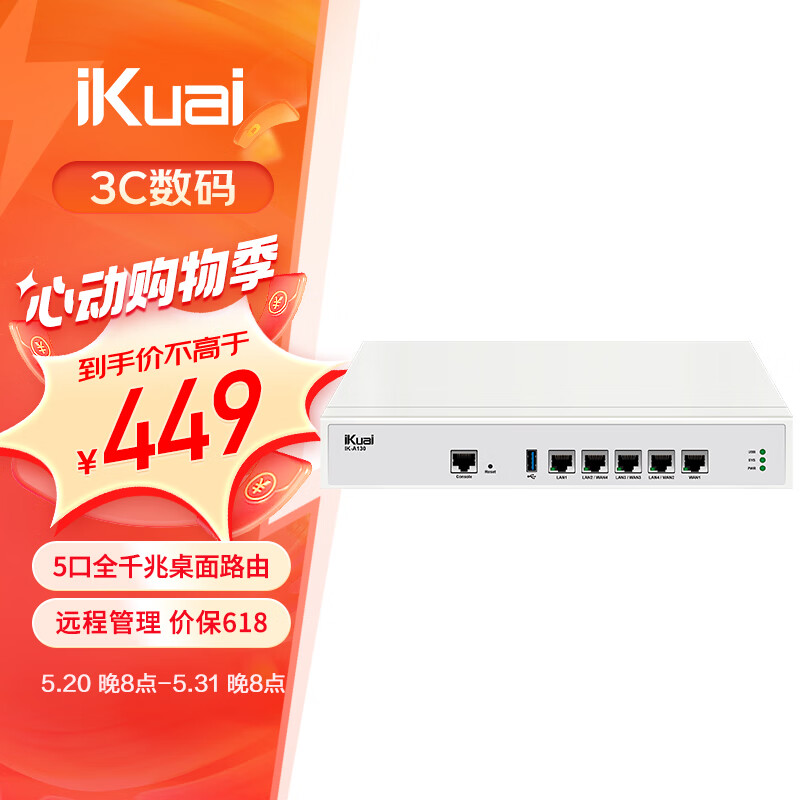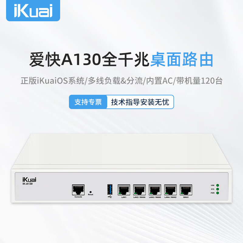 爱快(iKuai)企业级5口全千兆桌面路由器 网关路由多WAN/多LAN*4 USB3.0 内置防火墙/AC控制器//行为管理A130价格:499.00元!