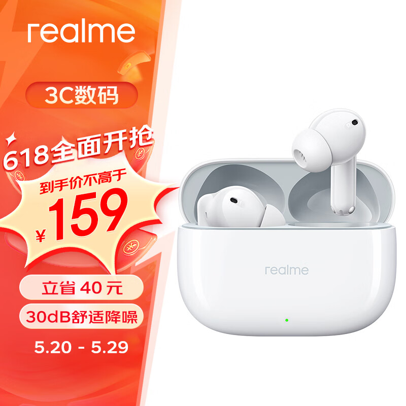 真我(realme)真我Buds T300 真无线蓝牙耳机 30dB舒适降噪 40小时长续航 华为苹果手机通用 活力白价格:159.00元!