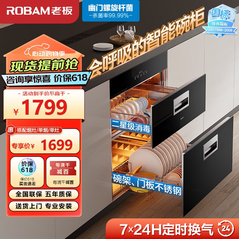 老板(Robam)消毒柜家用 嵌入式 消毒碗柜 105L双层大容量定时换气长效存储紫外线杀菌碗筷消毒柜XB711A价格:1899.00元!
