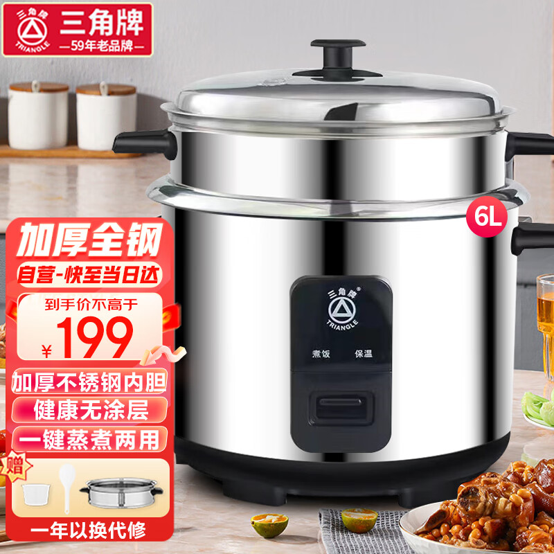 三角牌(Triangle)不锈钢直身电饭锅电饭煲老式全钢家用煮饭锅带蒸笼 ZD6L价格:199.00元!