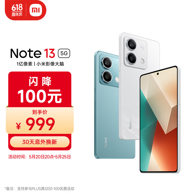 小米Redmi Note13 5G 1亿像素 超细四窄边OLED直屏 8GB+128GB 星沙白 SU7 5G手机价格:999.00元!