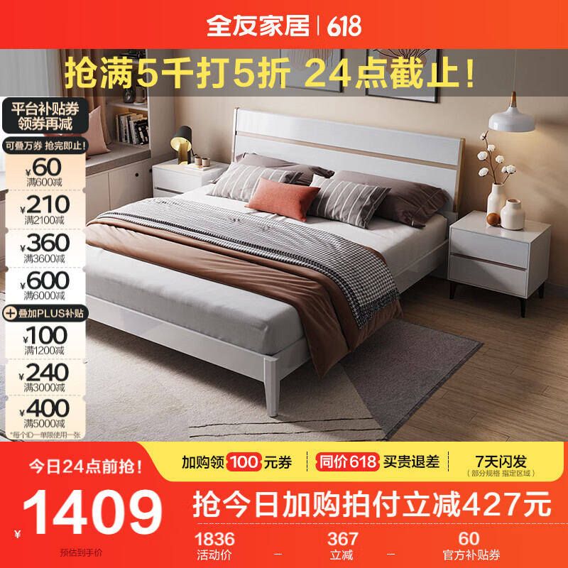 全友家居 床现代简约双人床双色拼接床屏板式床卧室家具126101B价格:1836.25元!
