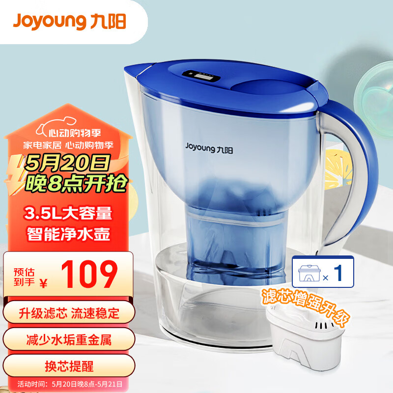 九阳(Joyoung)过滤净水器 家用滤水壶 净水壶(一壶1芯 ) 3.5L(蓝色)四重过滤 智能换芯提醒 JYW-B05E价格:109.00元!