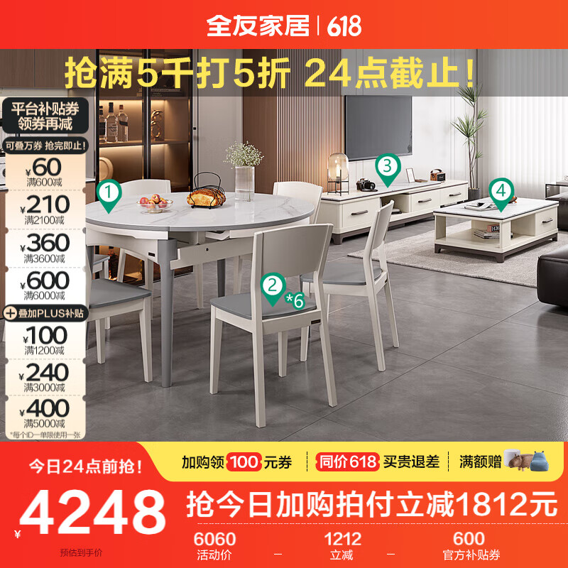 全友家居 现代岩板客餐厅9件套装120709茶几电视柜DW1028一桌六椅组合价格:6060.00元!