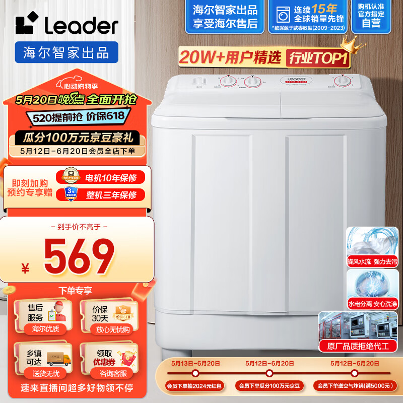 Leader海尔智家 半自动双缸洗衣机10公斤大容量下排水双桶内衣洗 旋风水流强力去污 以旧换新1188BS价格:569.00元!
