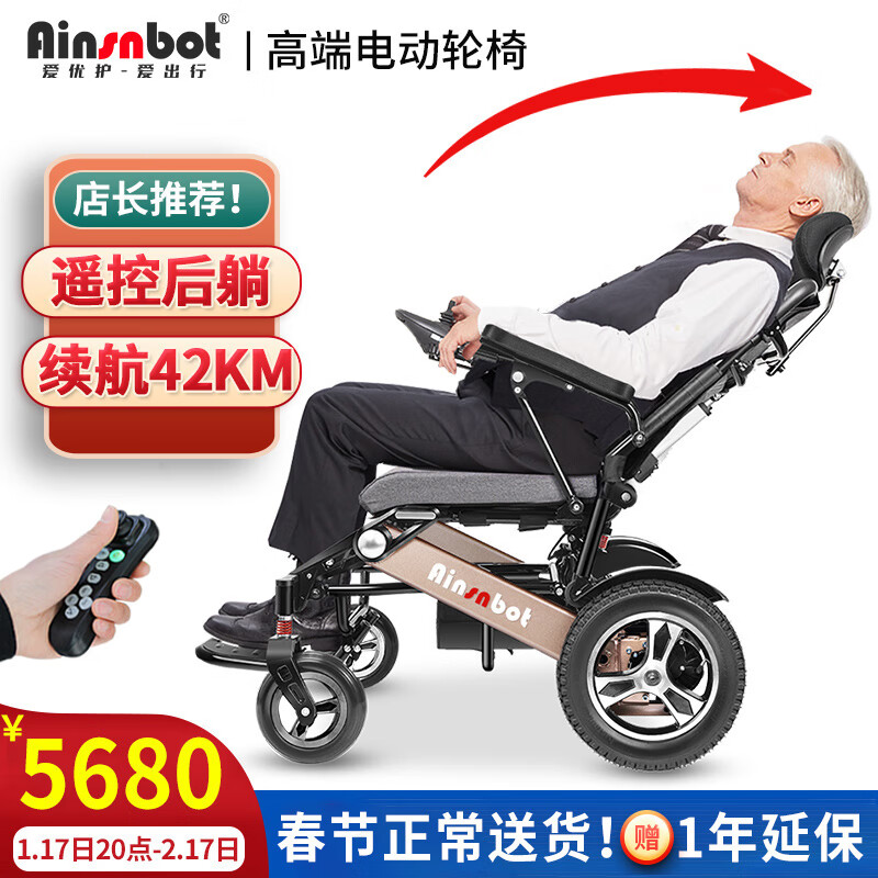 Ainsnbot 电动轮椅车 智能遥控全自动老年人残疾人家用出行轻便可折叠旅行老人后躺越野轮轮椅车双人价格:6280.00元!