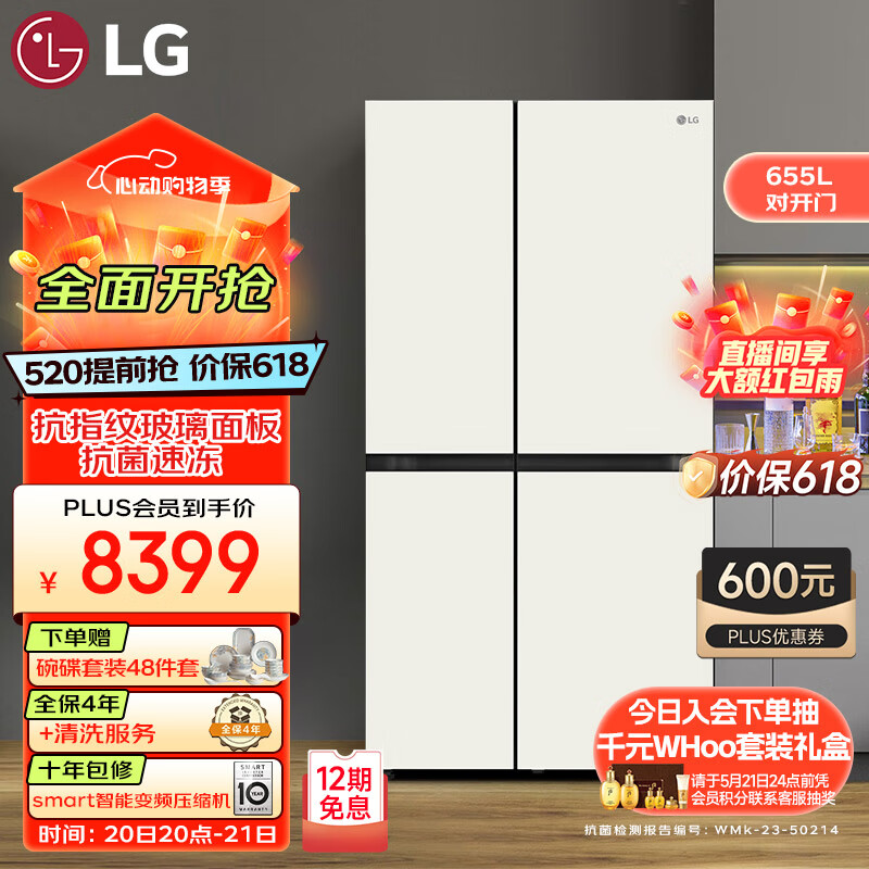 LG 655升大容量对开门冰箱双开门 抗指纹钢化玻璃面板 无霜变频 多维风幕 S652GTW16B凝脂白价格:9899.00元!
