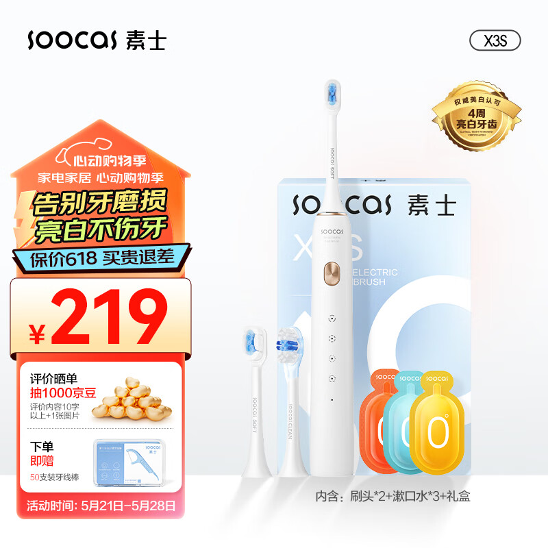 素士SOOCAS 电动牙刷 成人情侣亮白声波震动牙刷礼盒 X3S白(配云感刷头)送女友 520情人节礼物价格:299.00元!