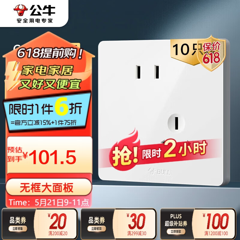 公牛(BULL)开关插座 G12系列10A斜五孔插座86型面板G12Z223AS 白色 十只装价格:170.00元!