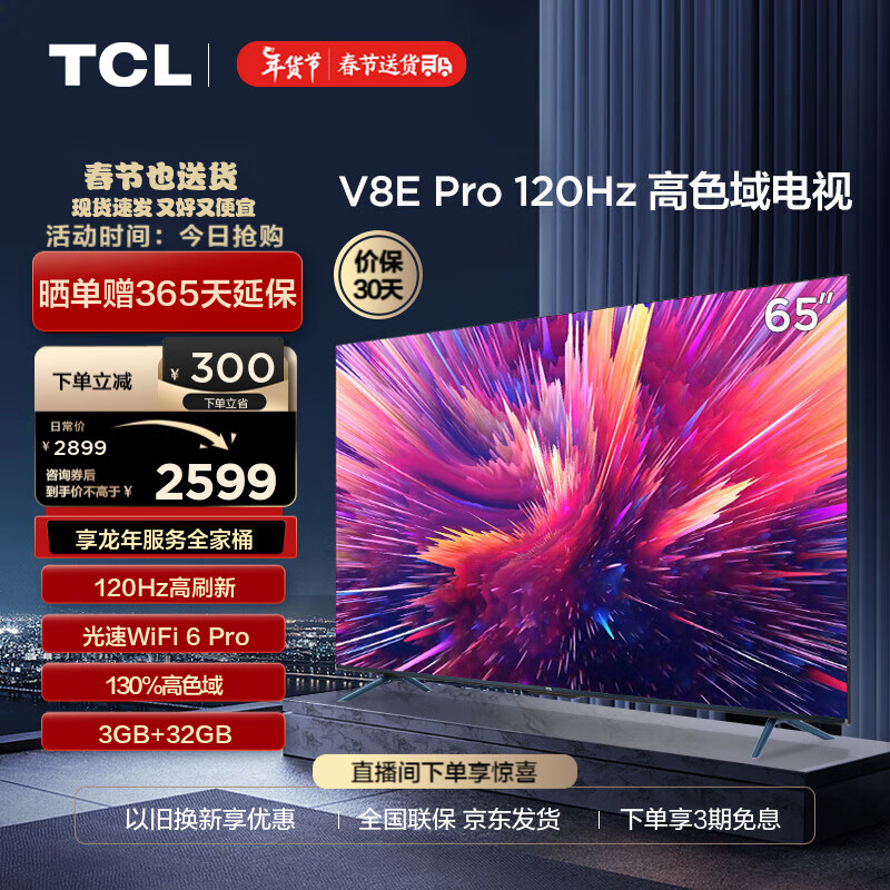 TCL电视 65V8E Pro 65英寸 120Hz WiFi 6 Pro 免遥控AI声控 金属屏 高色域 平板电视机 以旧换新价格:2899.00元!