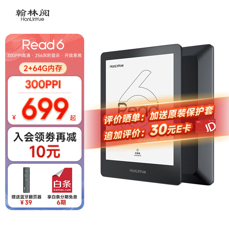 翰林阅Read6电子书阅读器6英寸64G内存300PPI墨水屏电纸书阅览器开放系统 深空黑价格:699.00元!