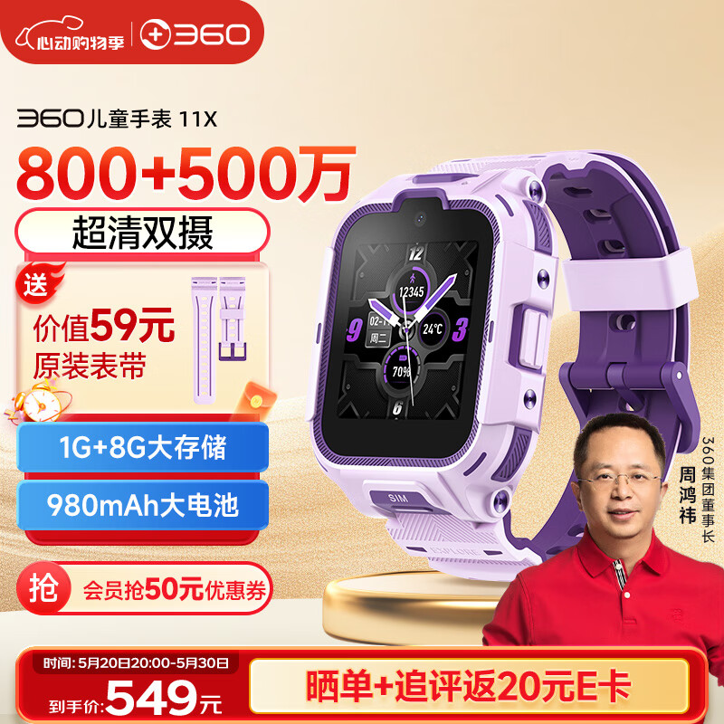 360【周鸿祎直播】儿童电话手表11X 高清双摄 儿童定位手表 超长续航4G通视频通话手表男女香芋紫价格:549.00元!