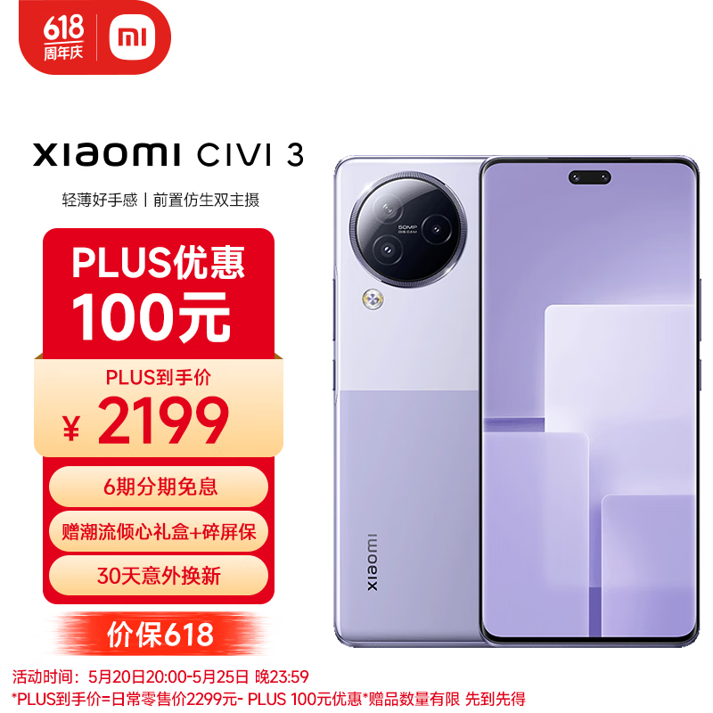 小米Civi 3 前置仿生双主摄 光学防抖镜头 12GB+256GB 玫瑰紫 5g手机 澎湃OS SU7小米汽车互联 AI手机价格:2299.00元!
