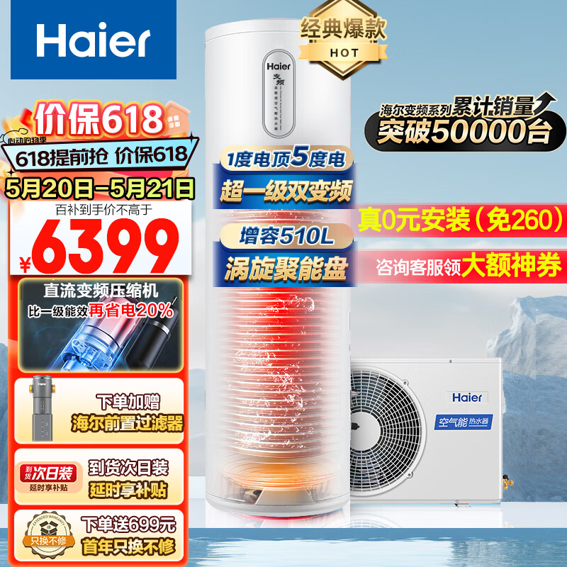海尔(Haier)空气能热水器200升包安装 超一级能效电辅80℃杀菌洗双变频超级节能效率500%京东小家 J7(4-6人)价格:6373.40元!