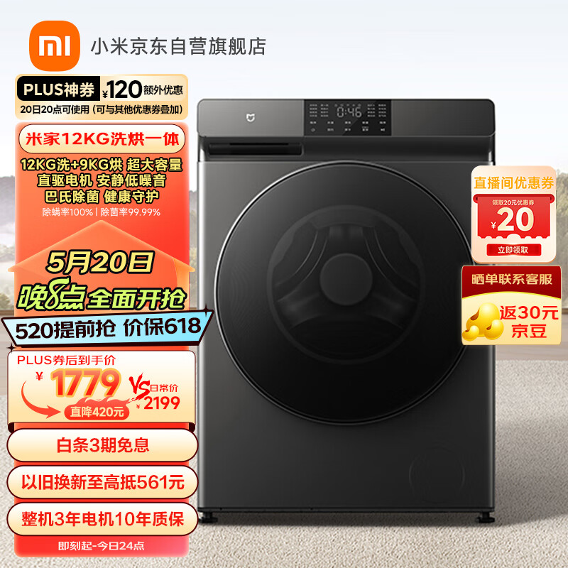 米家小米滚筒洗衣机全自动 12公斤超大容量洗烘一体 微蒸空气洗除菌直驱电机节能 XHQG120MJ202价格:1899.00元!