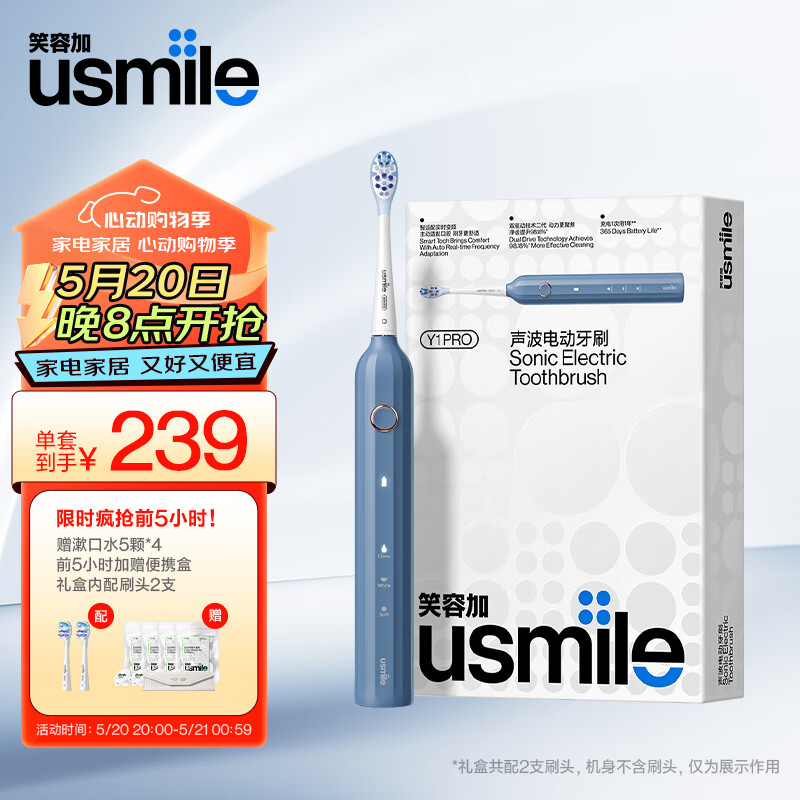 usmile 笑容加 电动牙刷 成人声波震动 情侣电动牙刷 送男友/送女友 Y1Pro雾蓝价格:239.00元!
