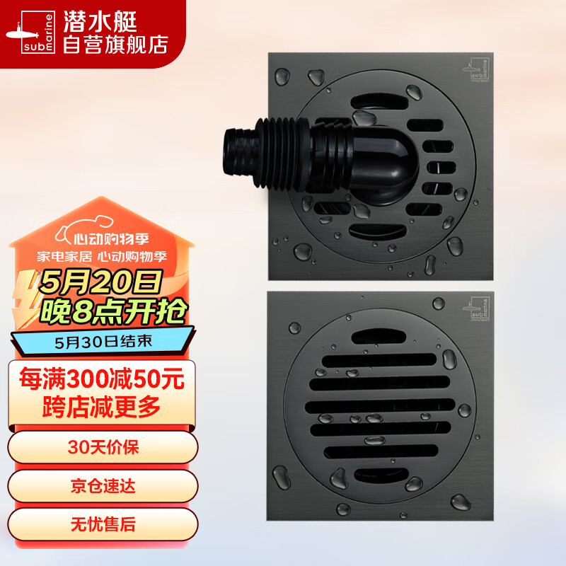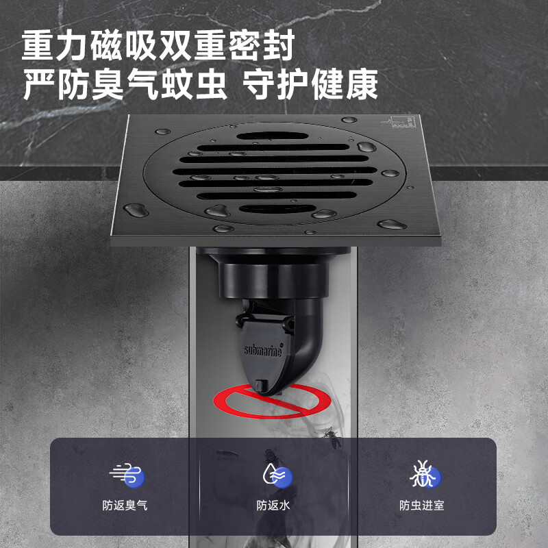潜水艇(Submarine)黄铜镀镍枪灰色拉丝面50管防臭地漏套装 干湿区通用+洗衣机价格:221.00元!