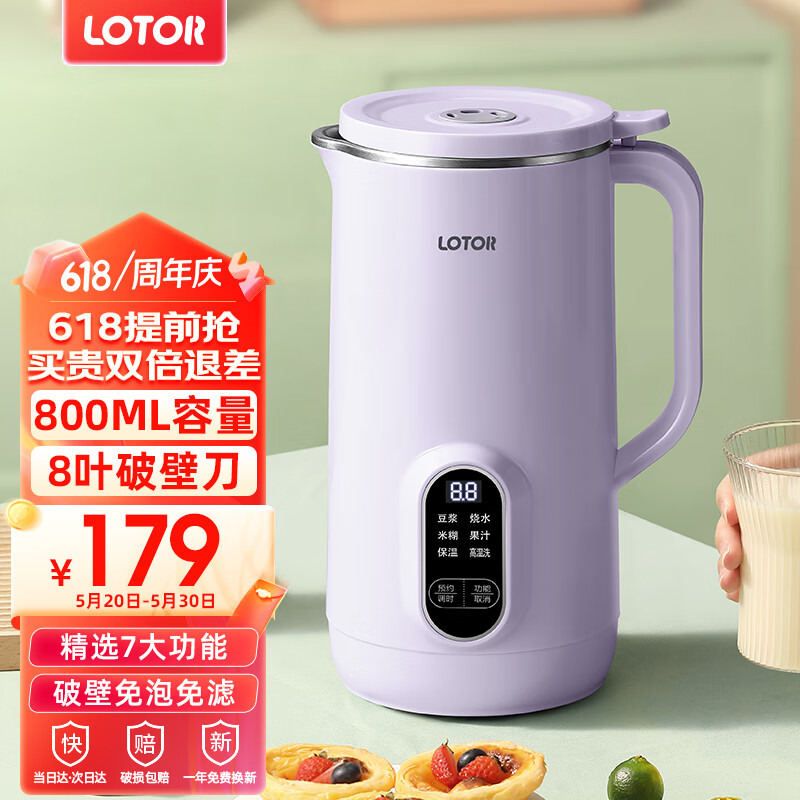 小浣熊豆浆机迷你破壁机1-2人家用小型全自动免滤免洗炸米糊榨汁杯搅拌婴儿辅食机3人4 0.8L紫色升级款价格:209.00元!