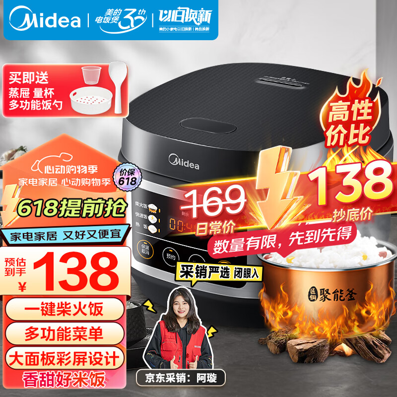 美的(Midea)智能电饭煲小电饭锅多功能3L快速饭感温焖煮香甜蒸米饭不粘锅FB30Q1-406K(2-6人)价格:138.00元!