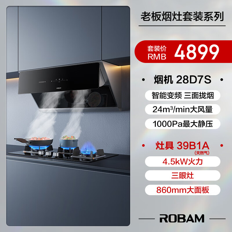 老板(Robam)油烟机三面拢烟智能变频吸油烟机家用侧吸24m3/min燃气灶具烟灶套装28D7S+39B1A(天然气)价格:4898.00元!