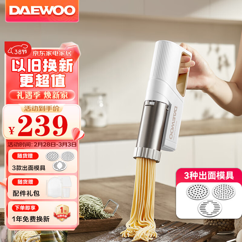 大宇(DAEWOO)面条机 手持压面枪 家用压面机 小型自动面条机 电动不锈钢压面条机 DY-MT04 奶油白【3模具】价格:239.00元!