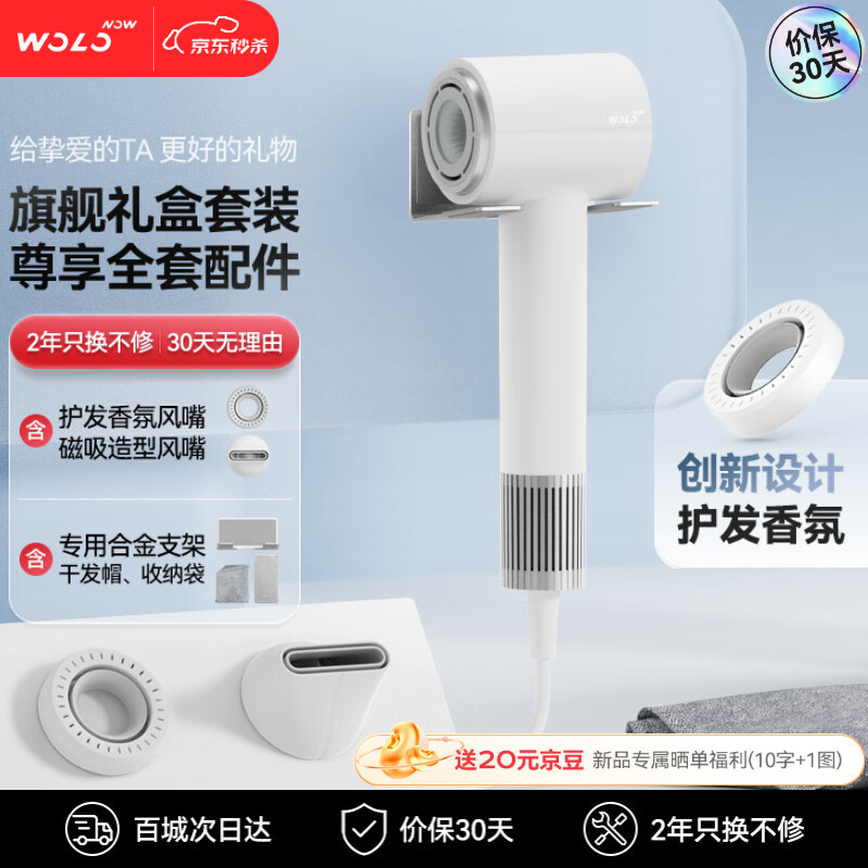 沃乐11万转高速吹风机护发香氛精油 大功率马达5亿级负离子家用电风筒速干生日礼物送女友 套装版白色价格:499.00元!