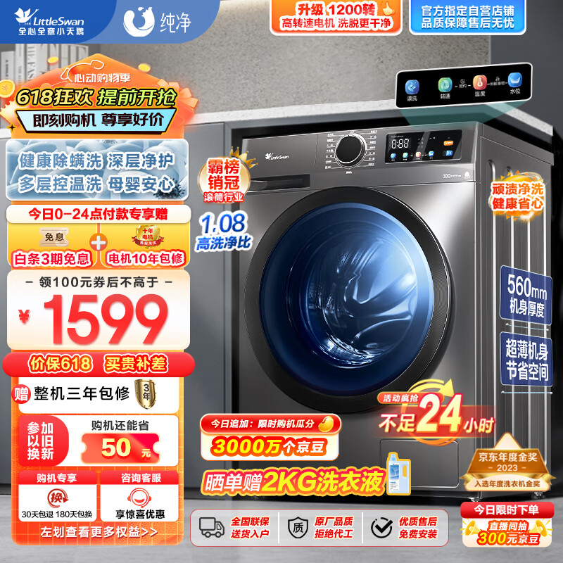 小天鹅(LittleSwan)滚筒洗衣机全自动【TG100APURE】深层除菌螨 10公斤大容量 排名前十名 以旧换新 超薄机身 家用价格:1679.00元!