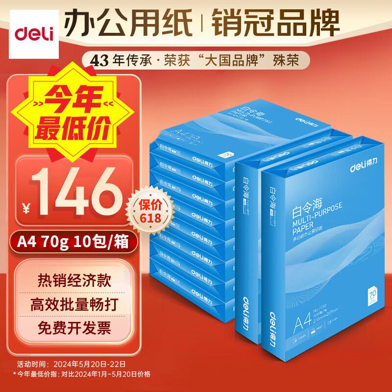 得力(deli)白令海A4打印纸 70g500张*10包一箱 双面高性价比复印纸 整箱5000张 7755【经济热销】价格:146.00元!