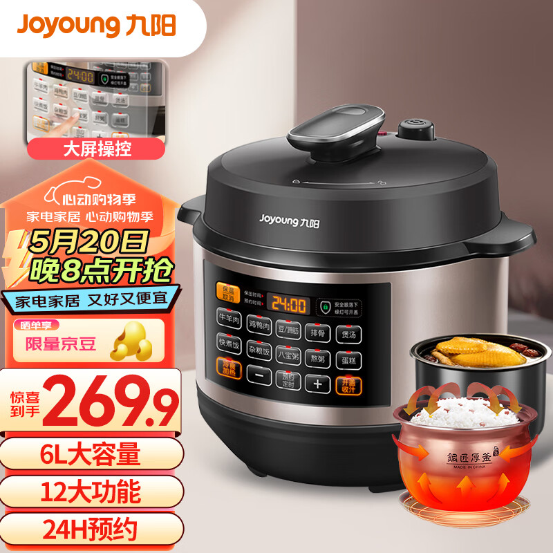 九阳(Joyoung)智能家用6L大容量电锅煲电高压锅一锅双胆大屏一键操作锅煮饭煲6升Y-60C817价格:269.90元!