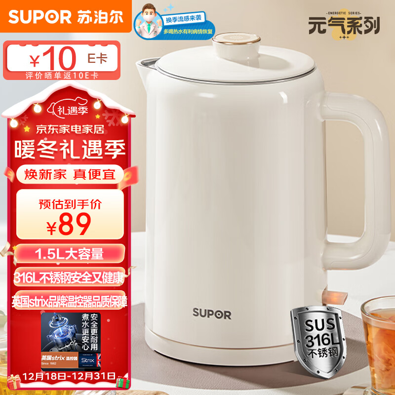 苏泊尔(SUPOR)电水壶热水壶 1.5L全钢无缝内胆 双层防烫电热水壶 316L不锈钢烧水壶 SW-15T108A价格:88.00元!