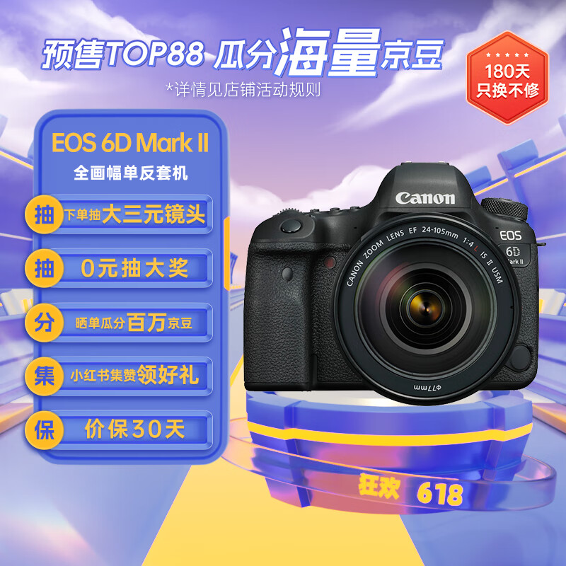 佳能(Canon)EOS 6D Mark II 6D2全画幅 专业单反相机 L级24-105标准镜头套装(约2620万像素/4K延时视频短片)价格:14600.00元!
