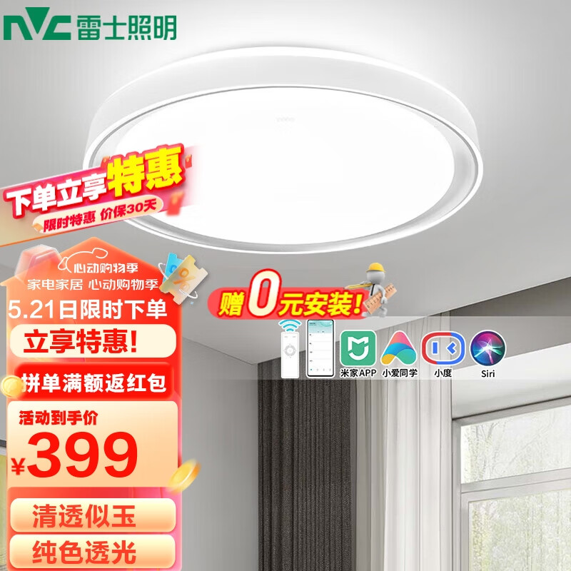 雷士(NVC)LED吸顶灯现代简约风格卧室书房厨房灯具AI语音调光圆形灯饰价格:399.00元!