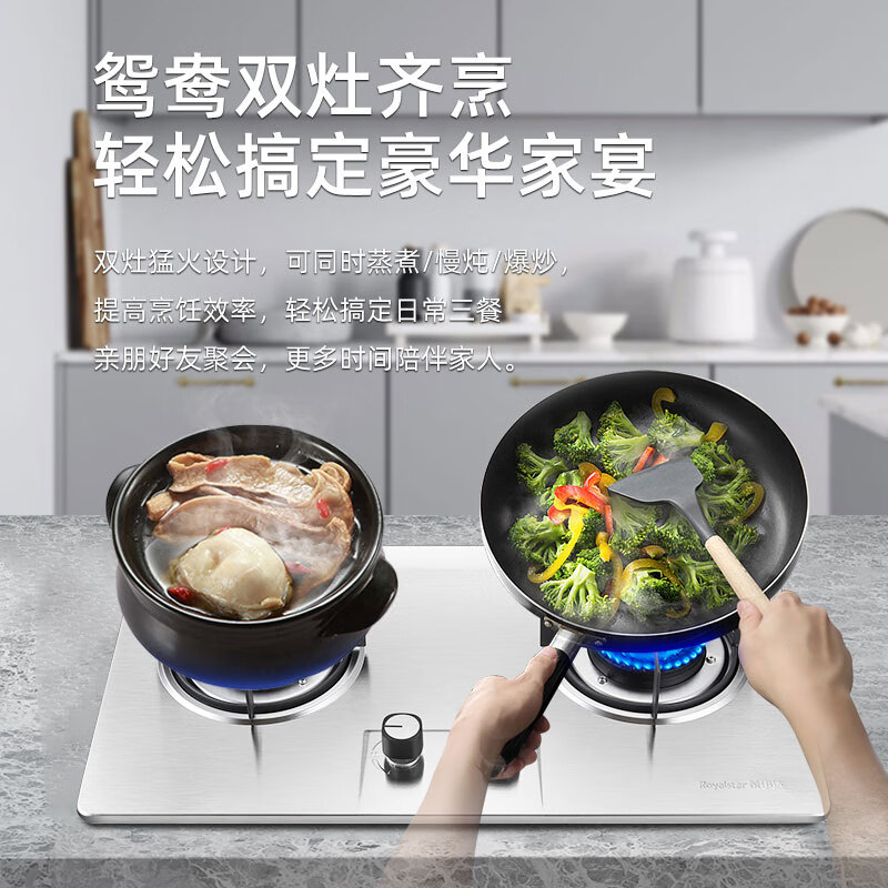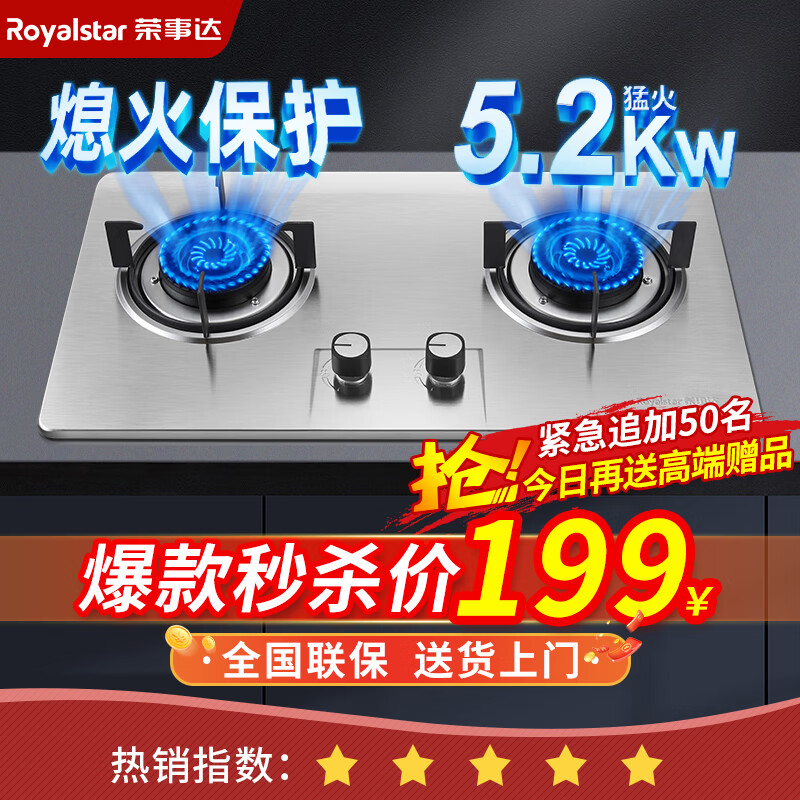 荣事达(Royalstar)燃气灶天然气双灶嵌入式家用5.2kw火力不锈钢熄火保护管道气猛火灶具RSD-R201 天然气价格:199.00元!