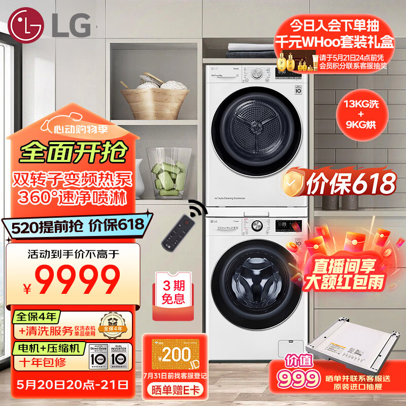 LG 容慧系列洗烘套装 13kg蒸汽除菌洗衣机+9kg原装进口变频热泵遥控烘干机 FCV13G4W+RC90V9AV4W价格:10999.00元!