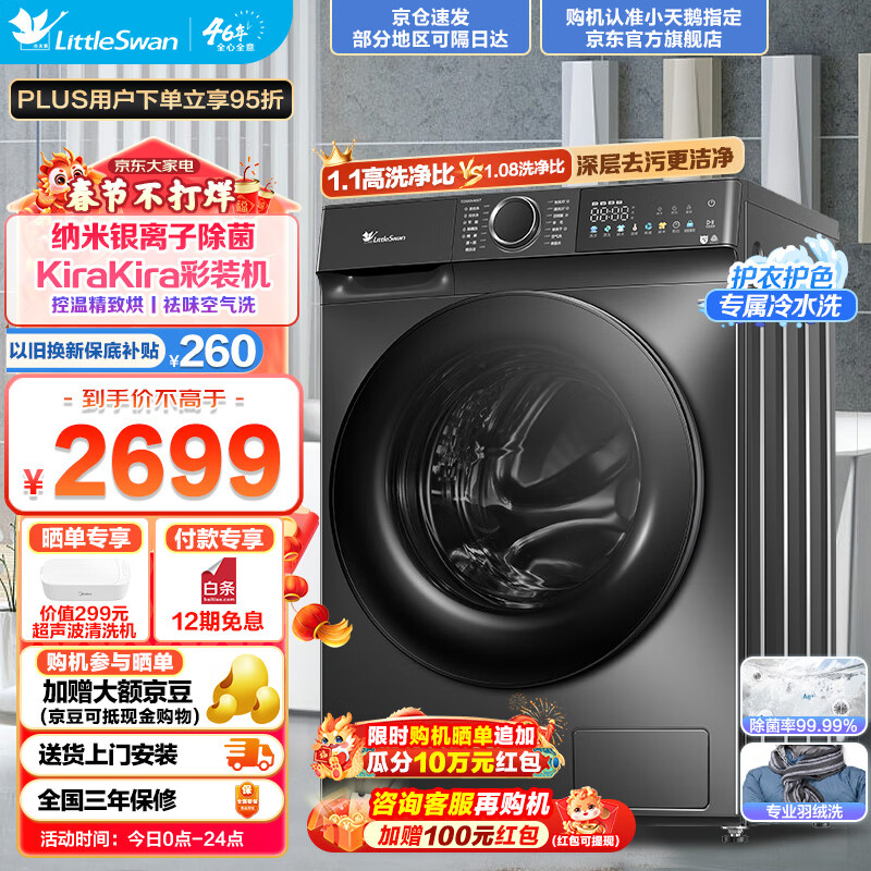 小天鹅(LittleSwan)滚筒洗衣机全自动 洗烘一体机带烘干 10公斤大容超薄智能家电变频除菌除螨1.1高洗净比 护色冷水洗 彩屏TD100V615T价格:2699.00元!