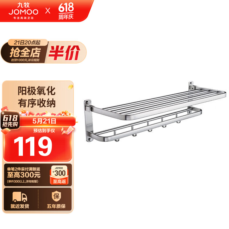 九牧(JOMOO)折叠毛巾架卫生间浴巾架浴室铝合金置物架五金卫浴挂件936004价格:119.00元!
