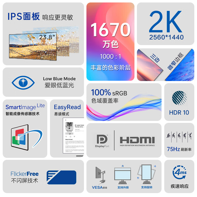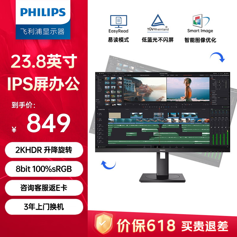 飞利浦(PHILIPS) 23.8英寸 2K 办公显示器 IPS屏 HDR 75Hz 低蓝光 HDMI+DP 旋转升降 壁挂 设计电脑显示器 245S9DR价格:849.00元!